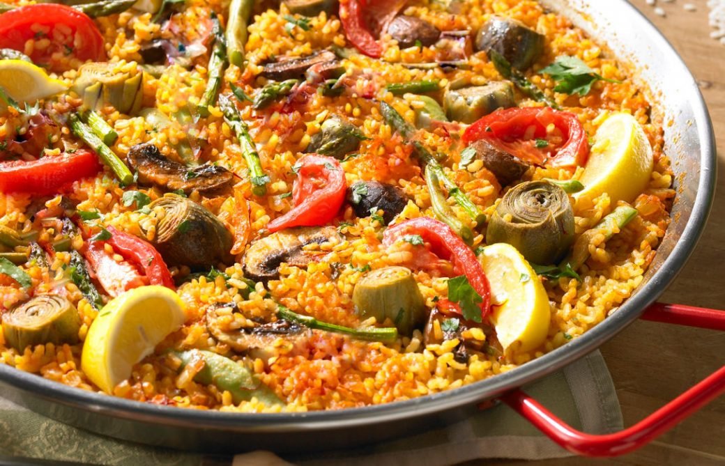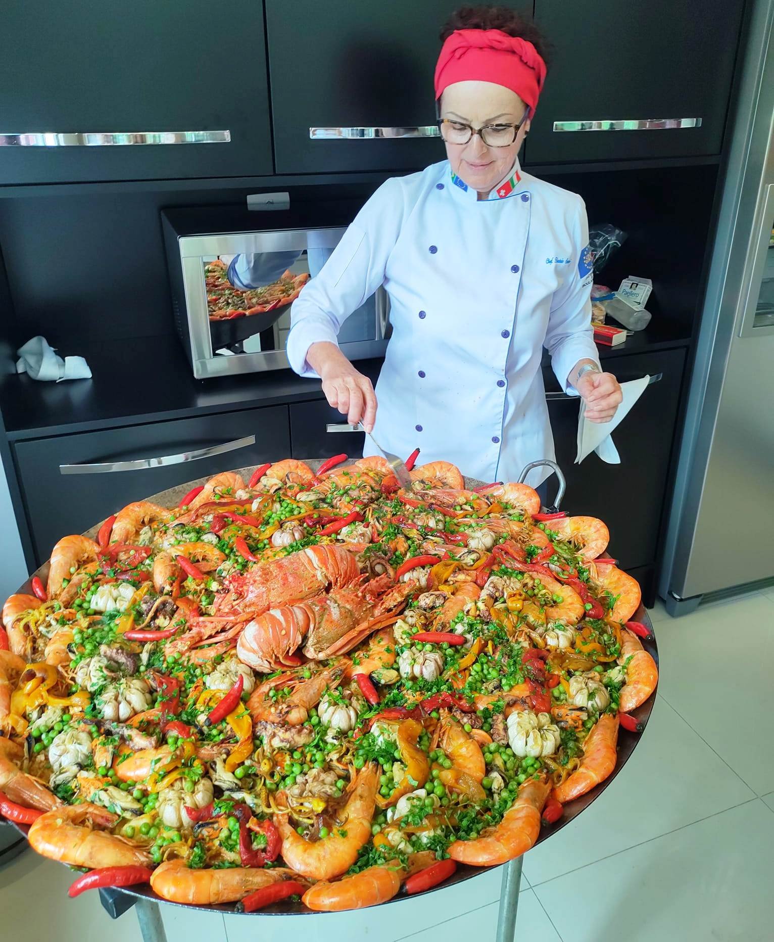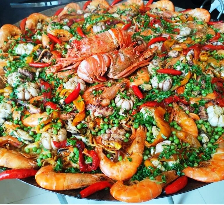 Aniverspario com paella espanhola tipo Valenciana, com diferentes tipos de carne e frutos do mar.