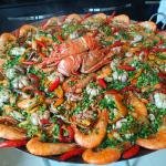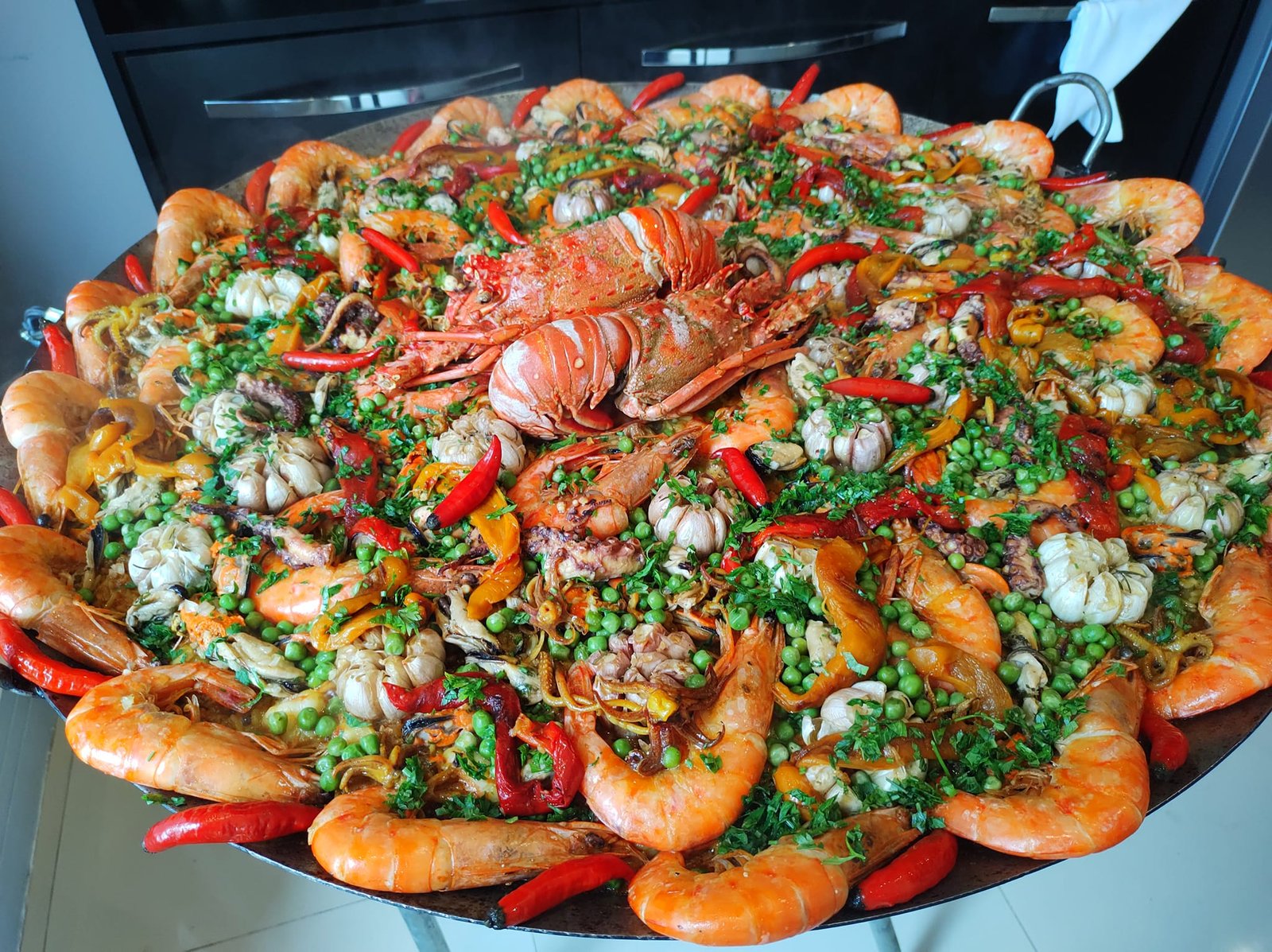 Aniverspario com paella espanhola tipo Valenciana, com diferentes tipos de carne e frutos do mar.